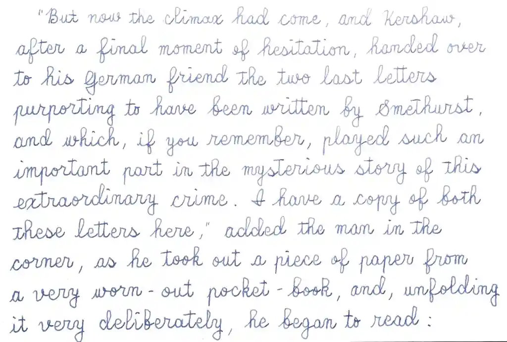 “But now the climax had come, and Kershaw, after a final moment of hesitation, handed over to his German friend the two last letters purporting to have been written by Smethurst, and which, if you remember, played such an important part in the mysterious story of this extraordinary crime.